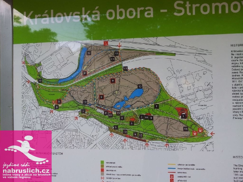 Inline stezka ve Stromovce. Slušná šířka, dobrý povrch (pozor na dvou místech je krátký úsek s dlažebními kostkami). Je zde poměrně hodně lidí, běhající, jezdící na kole i bruslích. Profil vyznačené trasy je rovný. Pro brusle jsou sjízdné i některé ostatní asfaltové chodníčky. Krásné příroda kousek od centra Prahy. Možnost odpočinku na lavičce i u stánků s občerstvením.
