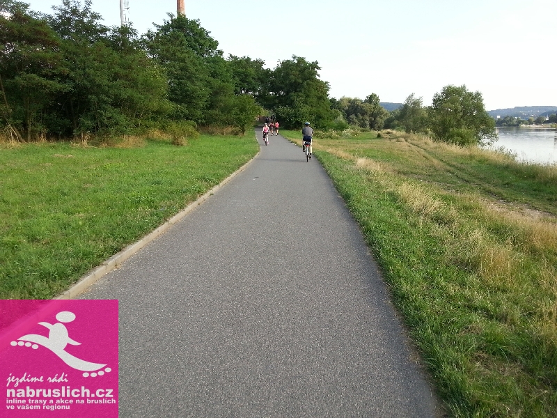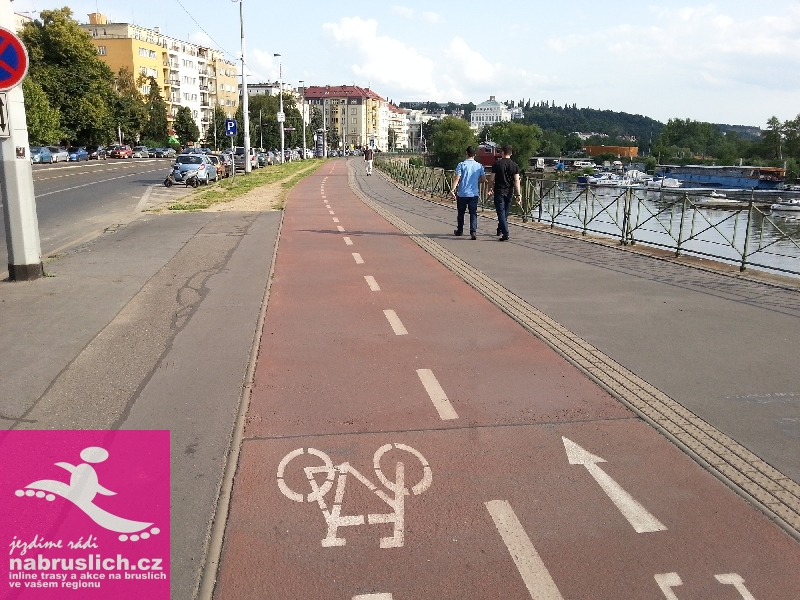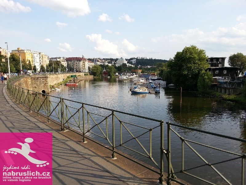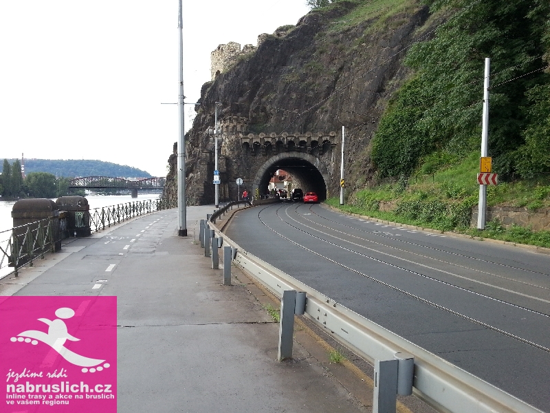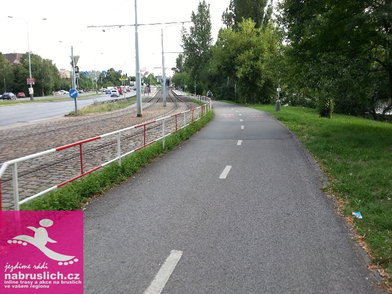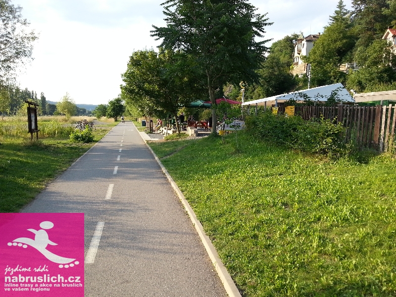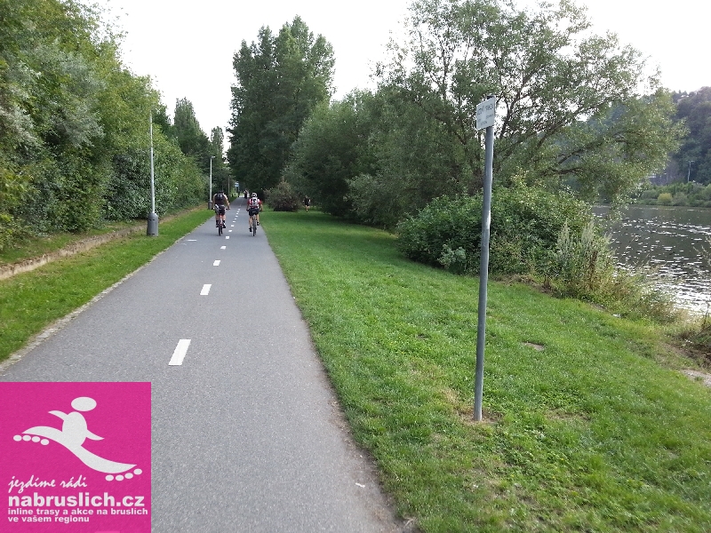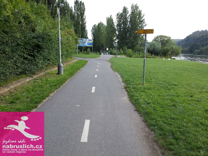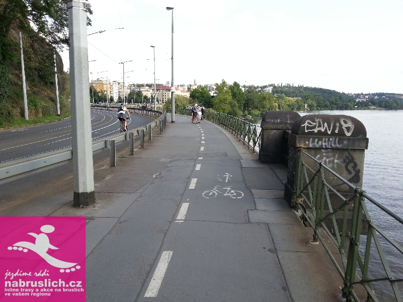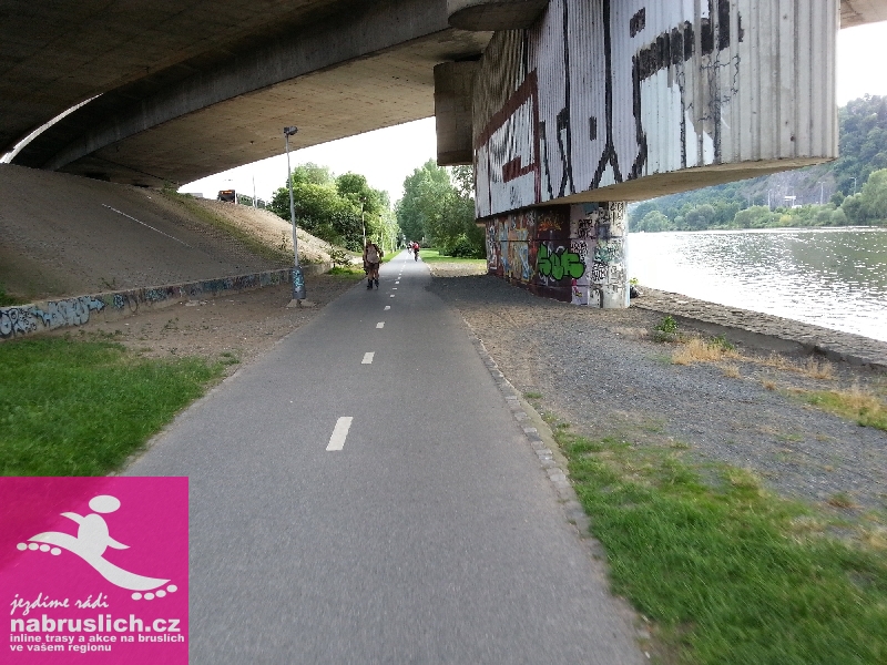 Trasa začínající pod mostem u Vyšehradu, trasa je příjemná, vede podél silnice, míjí Podolskou porodnici, Podolskou vodárnu, Podolský bazén, Žluté lázně, povrh je dobrý, sem tam nějaká oprava a nebo lehké zvlnění, je tam 1 přejezd před semafory a pak pár přejezdů před přechod, auta tam moc nejezdí, a také přejezd u benzínky Agip. Ideální začátek je buď Podolská vodárna TRAM, jsou zde lavičky na obutí, případně Dvorce, jen ale 1 lavička, pak i Přístaviště. U přístaviště jsou 2 možné trasy - jeden sešup celkem rychlý a je to tam zvlněné, jen pro zkušenější, a nebo pak přes zastávku TRAM Přístaviště. Pak už se zase jede dobře, jednou mírně více do kopečka kousek za Barrandovským mostem. Poté se jede kus po silnici, drncající asfatl, jsou tam další místa k parkování a začátku bruslení. Pokračuje se kolem golfového hřiště, a podél Vltavy od Braníku do Modřan. V Modřanech se jede kolem TRAM Nádraží Modřany, Obchodní náměstí, vlaková stanice Modřany. Pokračuje se pak na Zbraslav sále kolem Vltavy, přes Freestlye Park, kde se dá odpočinou, zasportovat i jinak. Dají se potkat dračí lodě Praha Chuchel. U nádraží Modřany je přívoz, lze přejet na druhou stranu na trasu Lihovar - Modřany i zde na webu popsaná - Podél strakonické (4.6). Opravdu pozor na TRHLINY u podjezdu Pražského okruhu, jsou dost široké a zalité jen okrajově asfaltem a dá se v nich hezky nechat brusle :-( Místo je označeno nápisem na trase. Trasa vede pod mostem a kolem vlakové traťě. Ve Zbraslavi je ke konci 2x občerstvení, ale dá se popojet ještě kousek po běžné silnici mezi chatkami a skončit kousek za mostem před Vlatavu ve Zbraslavi. Podél trasy je plno občerstvení, laviček, prolízaček, dá se lehce dostat na vlak, TRAM, BUS, takže v případě horšího počasí je jak rychle zmizet. Místy je trasa hodně úzká, jezdí tam dost cyklistů, v pátek v podvečer lidí tak akorát, jinak prý dost lidí vždy. Místy je super asfalt, hladký, místy drsný, drncavý, ale když se přejede, je to pak OK.