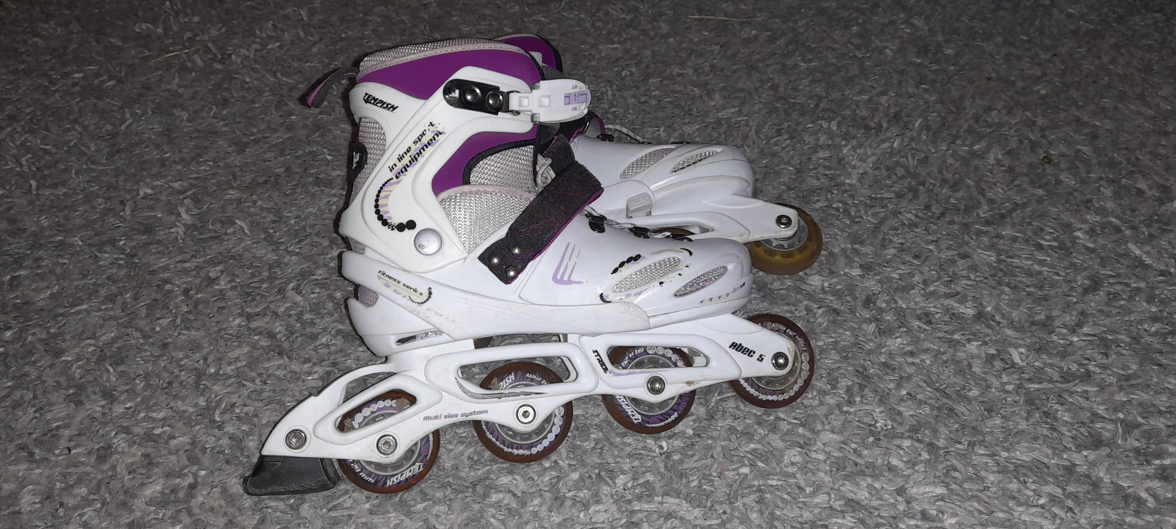 Používáné, nastavitelná velikost 36 - 39, kolečka ABEC 5 vhodné pro začátečníky. Kolečka jsou naprosto v pořádku, jen brusle mají pár škrábaců a oděrek.